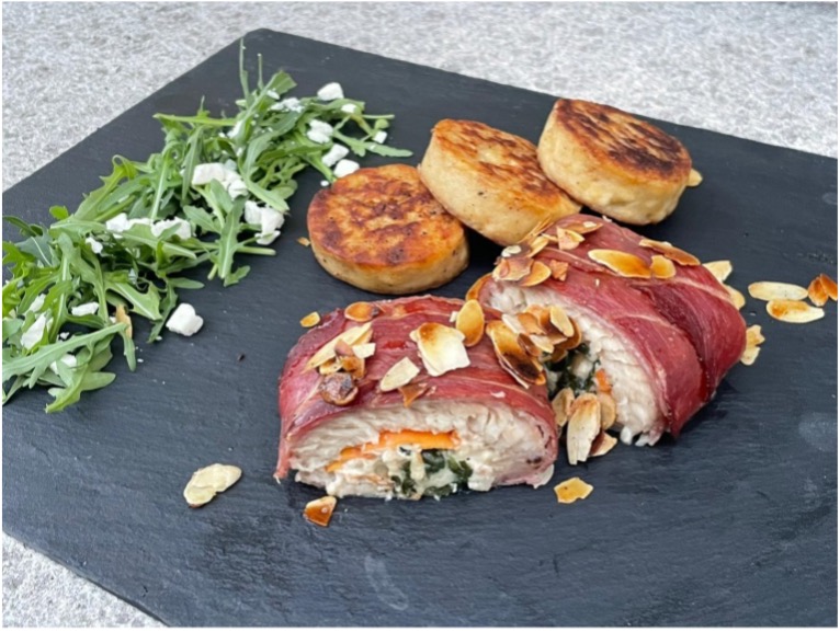 Gefüllte Welsroulade im Rohschinkenmantel