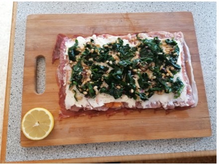 Zwiebel, Knoblauch, Blattspinat und Pinienkerne in Butter leicht anrösten, kurz überkühlen lassen und auf dem Frischkäse verteilen.